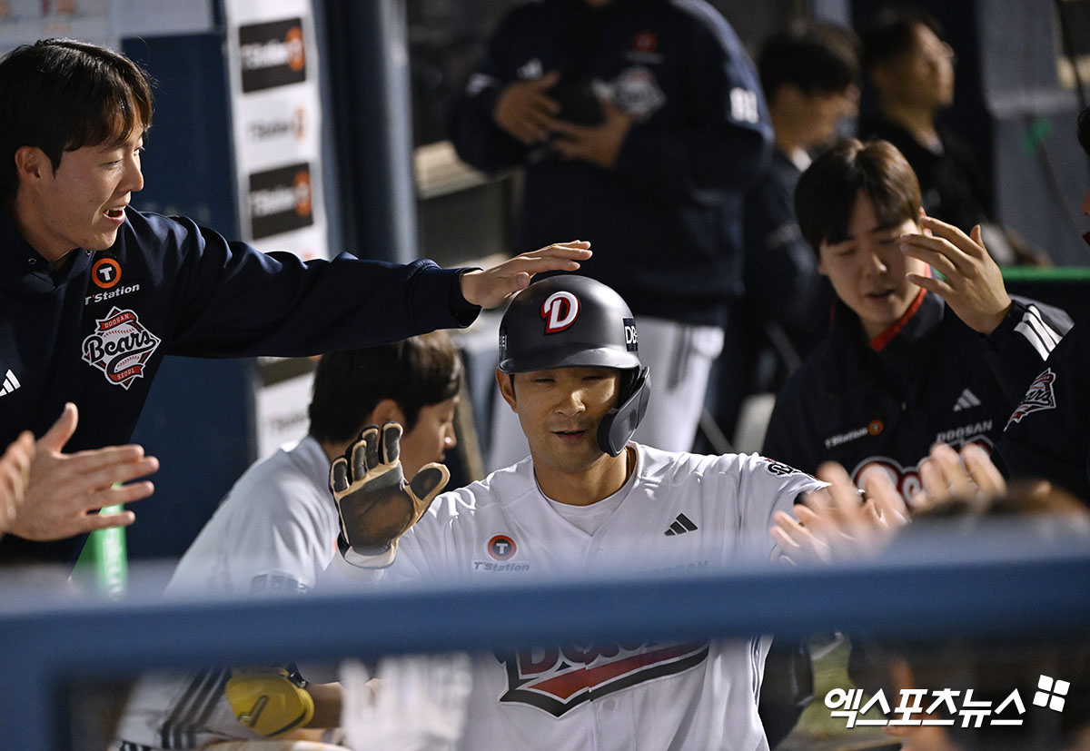 (엑스포츠뉴스 잠실, 김한준 기자) 18일 오후 서울 송파구 잠실야구장에서 열린 '2025 신한 SOL Bank KBO리그' KIA 타이거즈와 두산 베어스의 경기, 6회말 1사 3루 두산 강승호가 김인태의 1타점 2루타떄 득점에 성공한 후 더그아웃에서 축하를 받고 있다.
