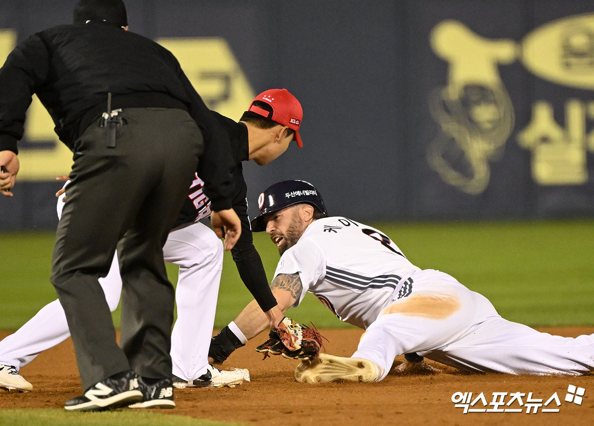 (엑스포츠뉴스 잠실, 김한준 기자) 18일 오후 서울 송파구 잠실야구장에서 열린 '2025 신한 SOL Bank KBO리그' KIA 타이거즈와 두산 베어스의 경기, 7회말 무사 1루 두산 케이브가 2루 도루에 성공하고 있다.