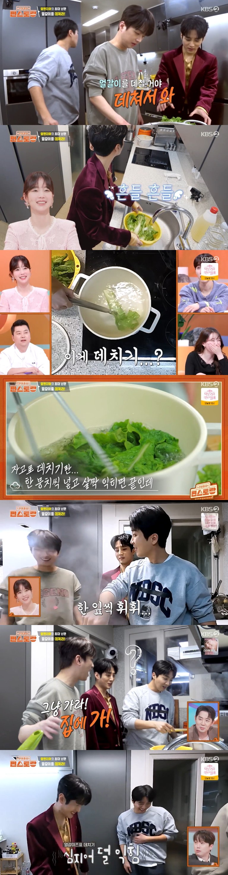 이찬원의 지시대로 물을 먼저 끓인 두 사람은 '데친다'는 개념에 대한 토론을 이어갔다. 김중연은 "소고기 샤브샤브처럼 데쳤다가 빼는 거지"라고 했고, 황윤성은 동의하며 "하나씩 정성스럽게"라고 덧붙였다.