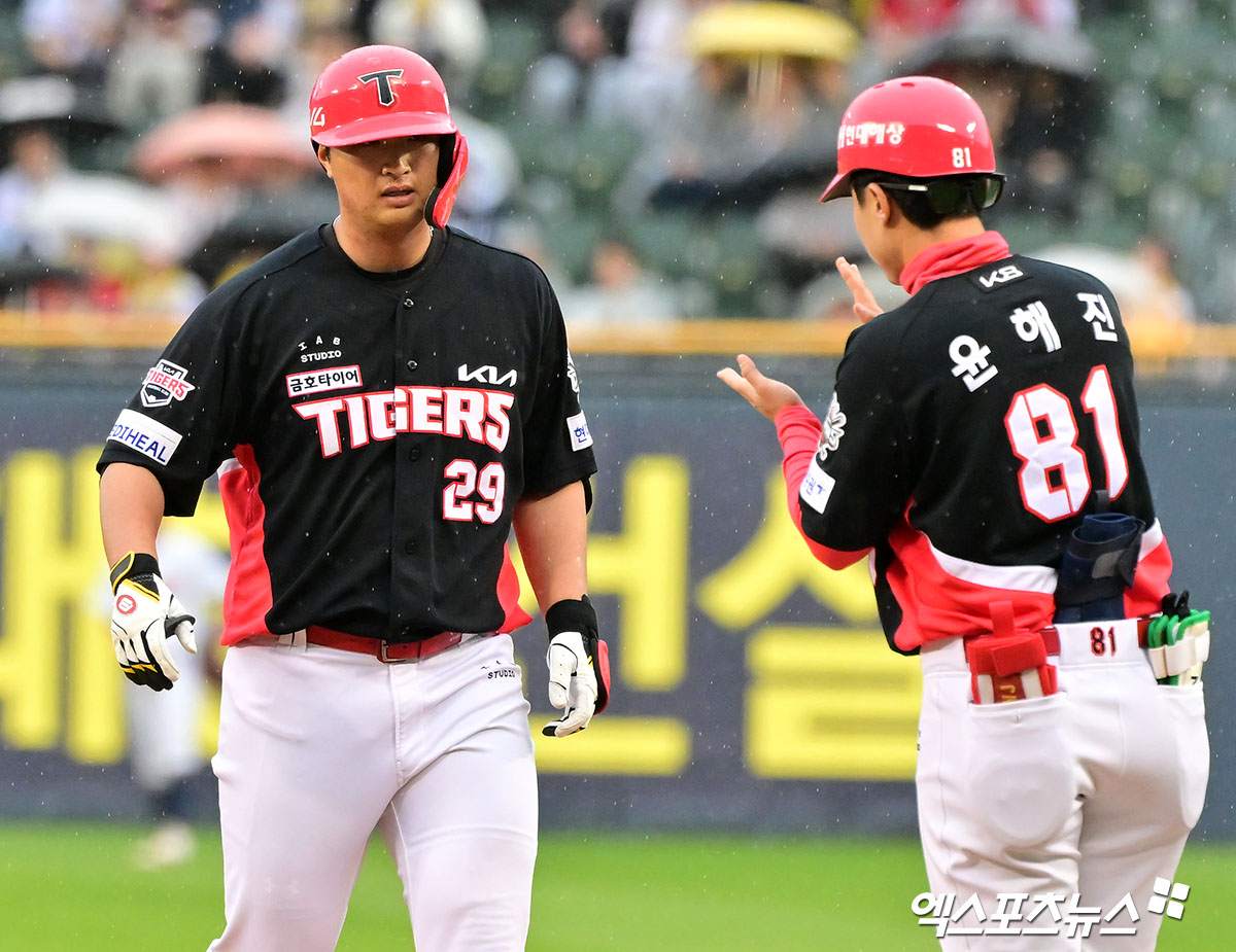 (엑스포츠뉴스 잠실, 김한준 기자) 19일 오후 서울 송파구 잠실야구장에서 열린 '2025 신한 SOL Bank KBO리그' KIA 타이거즈와 두산 베어스의 경기, 3회초 KIA 변우혁이 우중간 안타를 날린 후 귀루하고 있다.