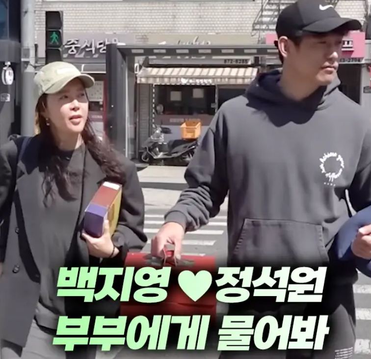 함께 공개된 사진에는 모자를 쓰고 올 블랙 패션으로 맞춰 입은 백지영, 정석원 부부의 모습이 담겨 있다. 두 사람은 각자 양손에 물건을 든 채 다정하게 길거리를 걷고 있다.