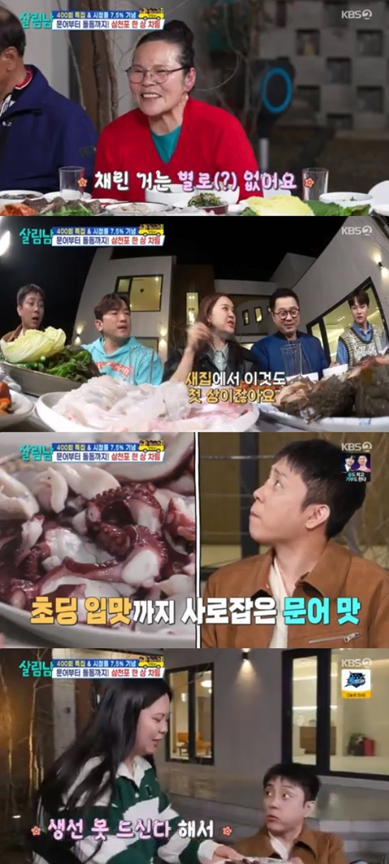 다시 한 자리에 모인 박서진 가족과 출연자들은 문어, 낙지호롱구이, 돌돔 등으로 푸짐하게 차려진 삼천포 한상으로 식사를 시작했다.