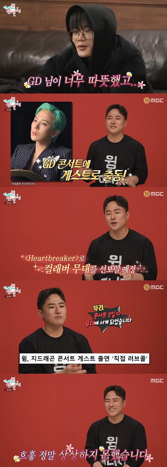 이어 매니저가 "어제 어땠어?"라고 묻자 윙은 "추웠는데 GD님이 너무 따뜻했다"며 지드래곤을 향한 마음을 내비쳤다. 윙은 지드래곤 콘서트에서 ‘하트브레이커’ 무대에 직접 제안받아 함께 공연하게 된 사실을 전하며 놀라움을 자아냈다.