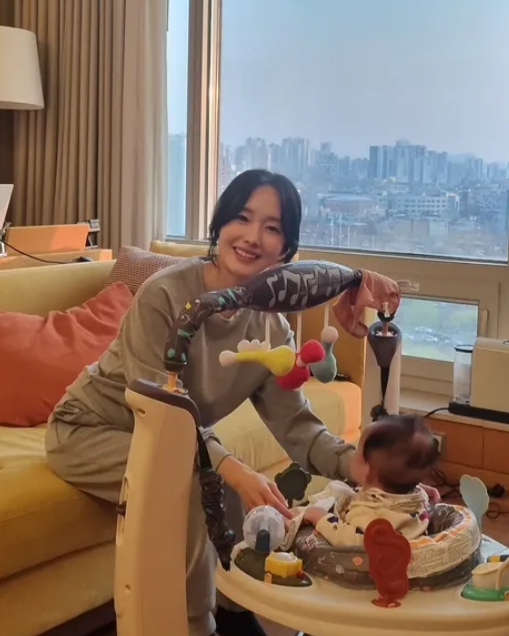 공개된 사진 속 이정현은 시티뷰가 보이는 커다란 창문이 있는 호텔에서 보행기에 태운 둘째 딸과 놀아주면서도 카메라를 향해 밝게 미소 짓고 있다.