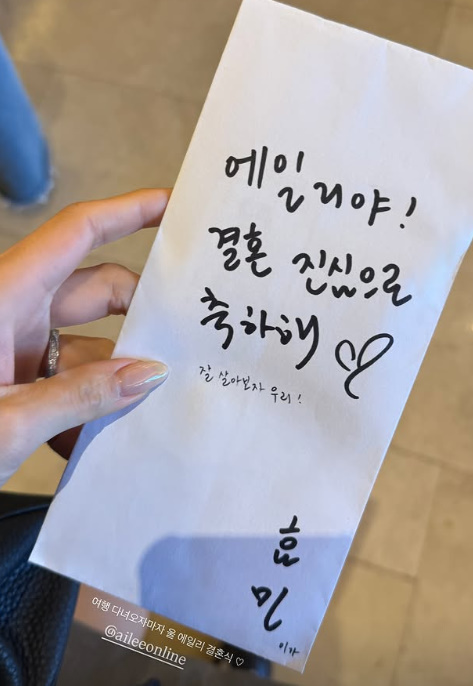 공개된 사진 속에는 효민이 에일리를 위해 준비한 축의금 봉투가 담겨있다. 봉투 위에는 '에일리야 결혼 진심으로 축하해. 잘살아보자 우리. 효민이가'라는 글이 담겨있다.