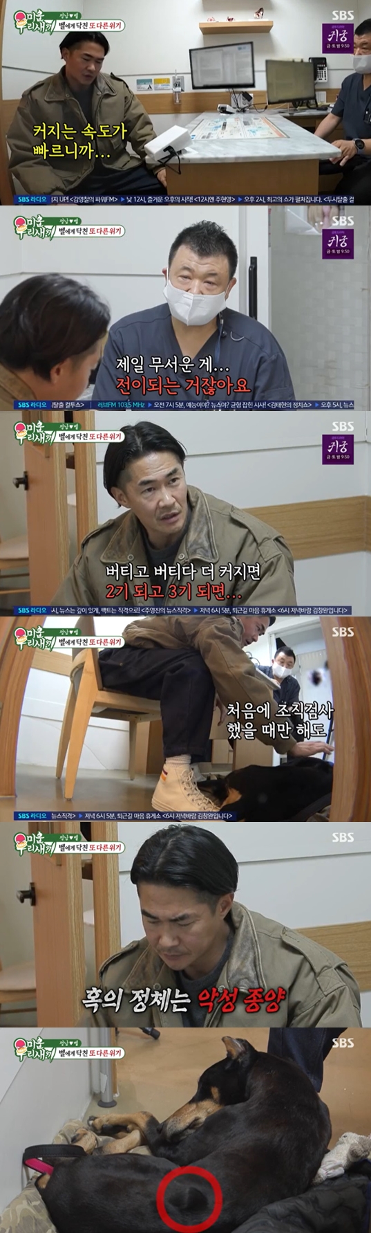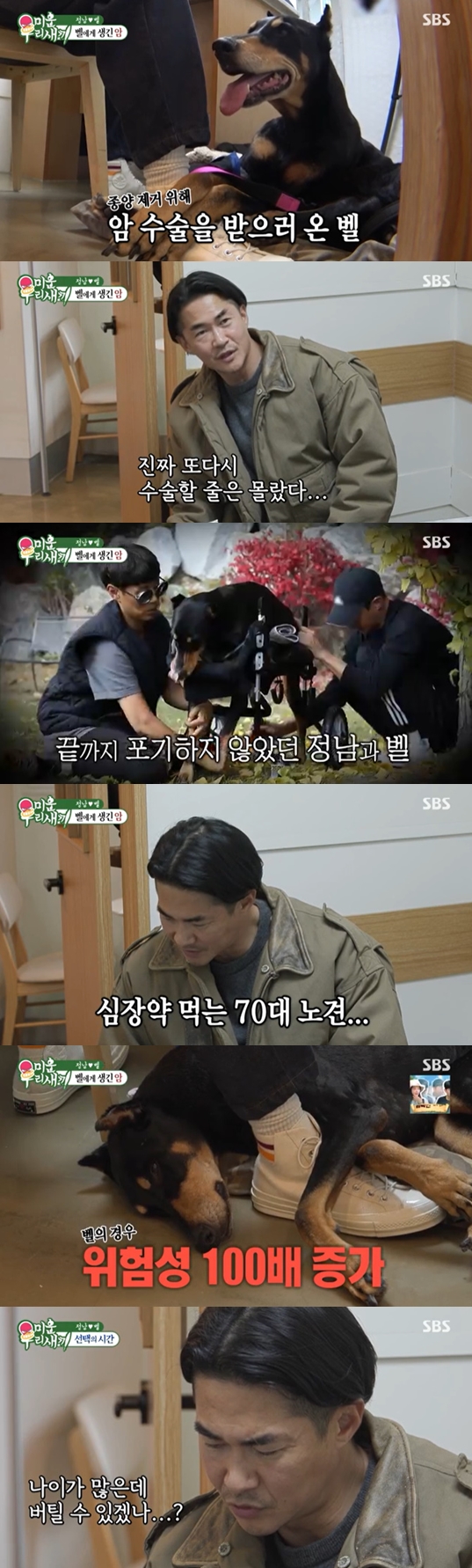 이어 전신마취와 극소 마취 중 고민하는 배정남은 "극소마취하면 몇프로정도 떼어낼 수 있냐"라며 묻자, 수의사는 "주변을 극소마취하면 겉에 보이는 종양은 떼어낼 수 있는데 안쪽은 들어가봐야 알 수 있다. 극소 마취는 쇼크 위험도가 거의없다. 그 자리에서도 재발은 할 수 있지만 시간은 벌 수 있다"라며 전했다.