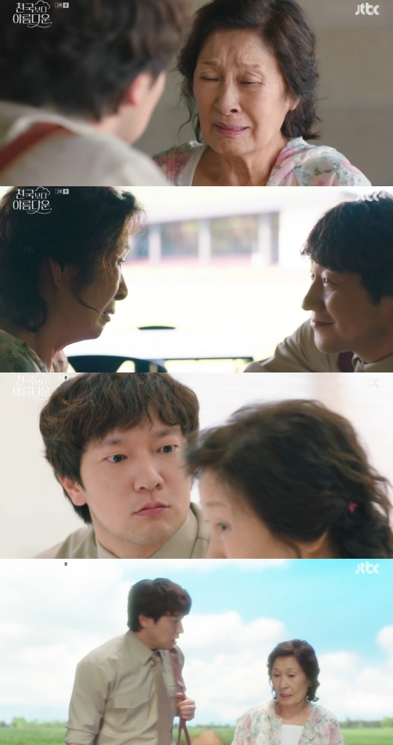20일 방송된 JTBC 새 토일드라마 '천국보다 아름다운' 2회에서는 고낙준(손석구 분)과 이해숙(김혜자)이 천국에서 재회한 모습이 그려졌다.