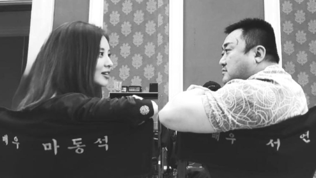 함께 공개된 사진 속 서현은 마동석과 마주앉아 서로의 팔꿈치를 보여주며 팽팽한 긴장감을 자아냈다. 두 사람의 확연하게 다른 체구가 웃음을 자아낸다.