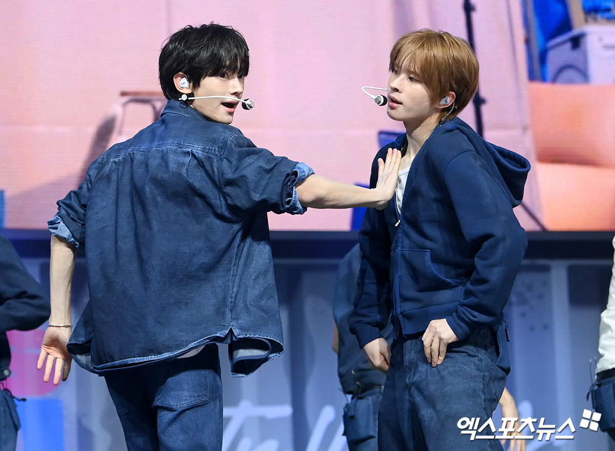 이날 쇼케이스에 참석한 그룹 투어스 한진, 경민이 타이틀곡 '마음 따라 뛰는 건 멋지지 않아?' 무대를 선보이고 있다.