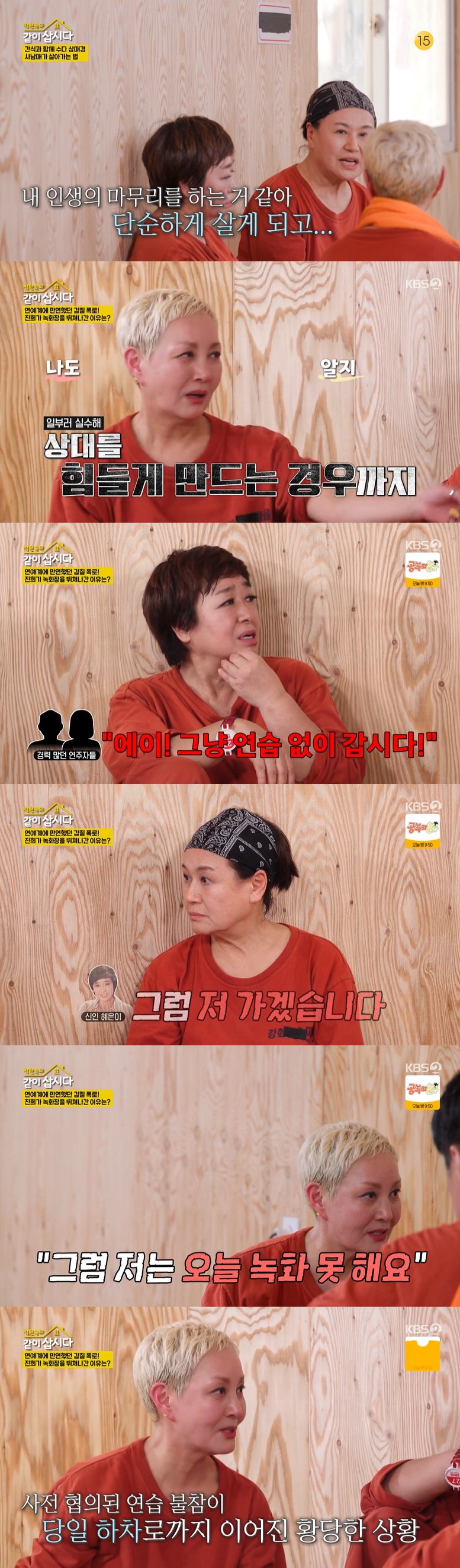 이를 들은 홍진희는 "일일극에서 섭외가 왔다. 연습 시간이 스케줄이 안 되어서 못 간다고 했다. 매번 연습에 빠지니 선배들은 꼴 보기 싫을 수 있지 않냐. 어느날 녹화하러 갔는데 느닷없이 내가 고향으로 빠지더라. 제작진에게 물어봤더니 막 핑계를 대길래 '녹화 오늘 못한다'고 했다"며 황당했던 한 촬영 현장을 폭로했다.