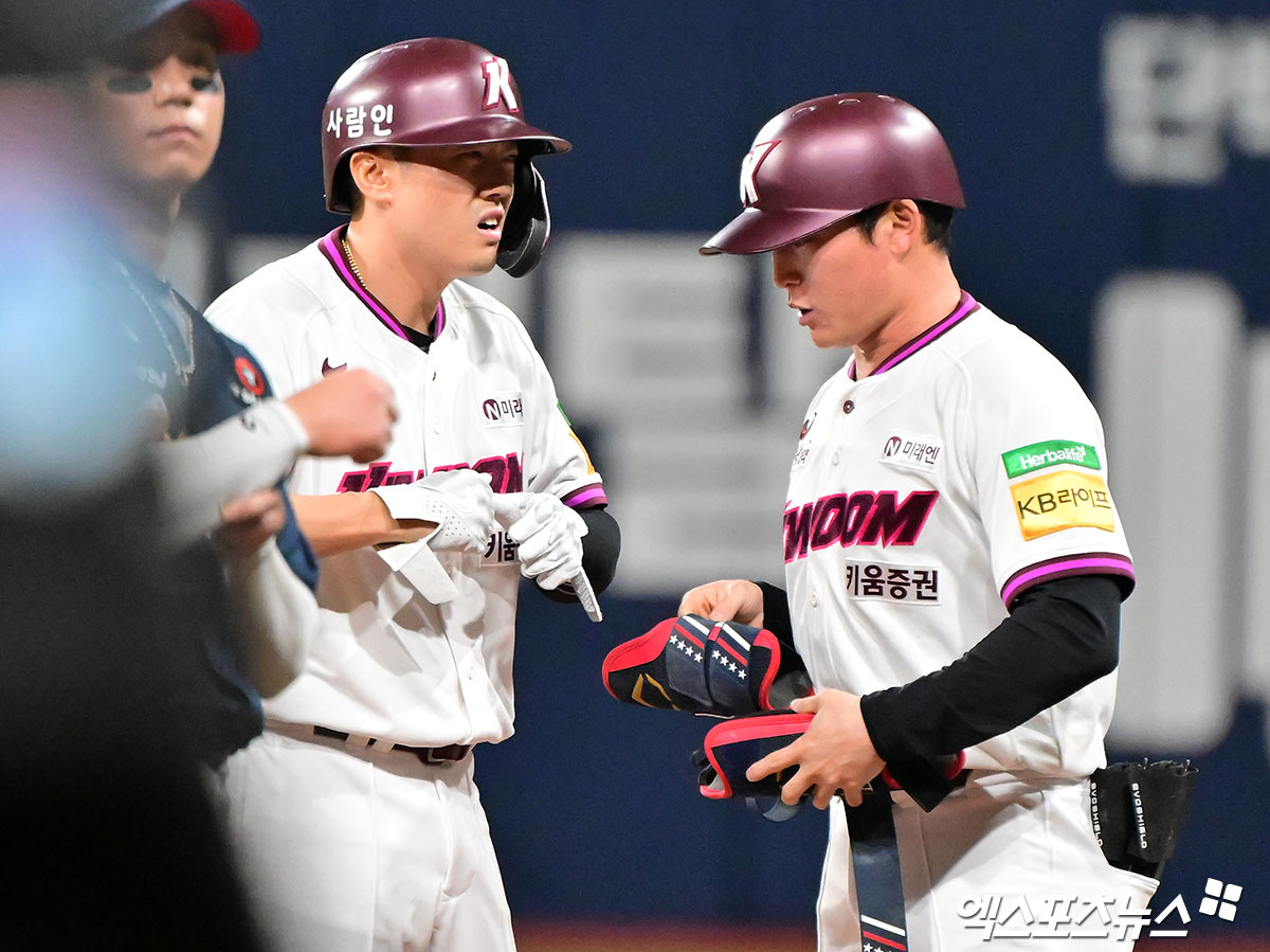 (엑스포츠뉴스 고척, 김한준 기자) 22일 오후 서울 구로구 고척스카이돔에서 열린 '2025 신한 SOL Bank KBO리그' 두산 베어스와 키움 히어로즈의 경기, 2회말 1사 1,2루 키움 오선진이 1타점 2루타를 날린 후 타임을 요청하고 있다.