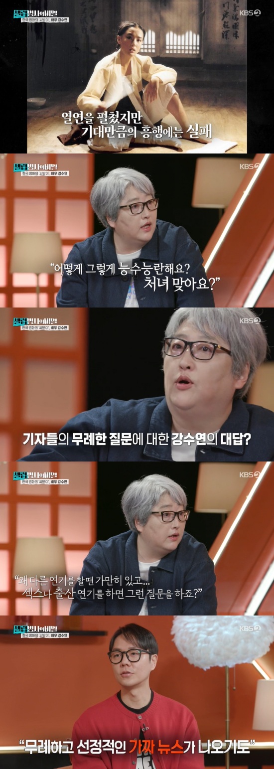 이러한 무례한 기자들의 질문에 강수연은 "왜 다른 연기를 할 땐 가만히 있고, 여성 배우가 섹스나 출산 연기를 하면 그런 질문을 하느냐"고 답했다고.