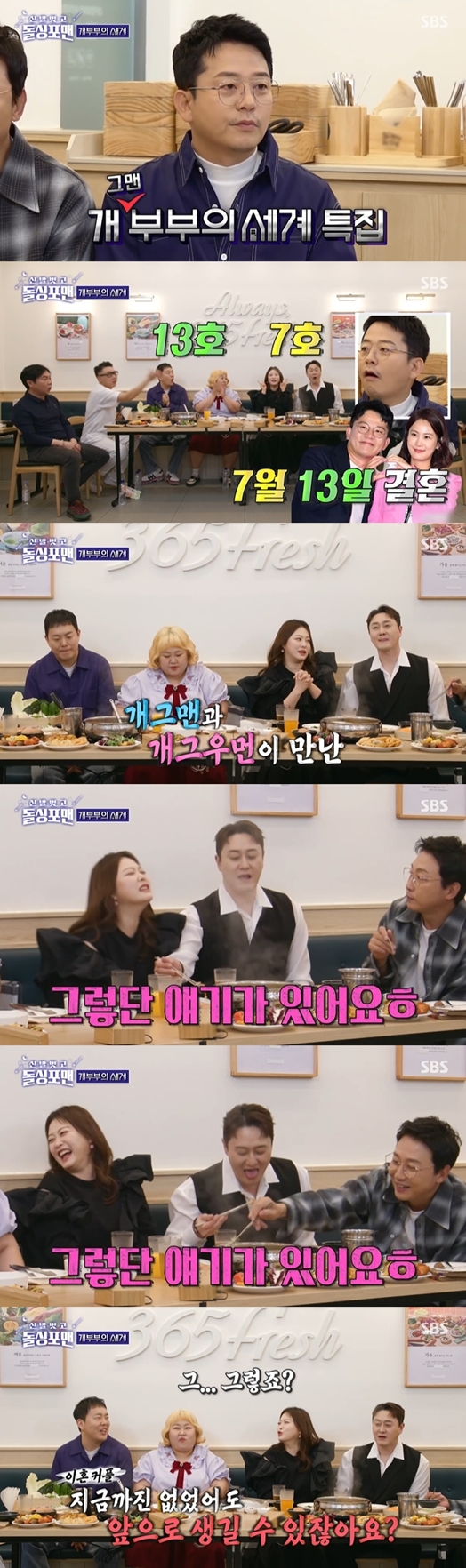 22일 방송된 SBS 예능 프로그램 '신발 벗고 돌싱포맨'에서는 '개(그맨)부부의 세계 특집'이 꾸며졌다. 이날 게스트로는 개그맨 부부인 김원효♥심진화, 김민기♥홍윤화 부부가 출연해 이야기를 나눴다.