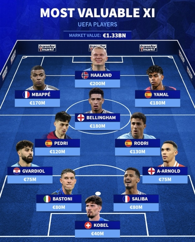 독일 축구 이적시장 전문 사이트 '트란스퍼마르크트'는 23일(한국시간) 전 세계 대륙별 각 포지션에 가장 가치 있는 선수들로 11명을 구성한 라인업을 공개했다.