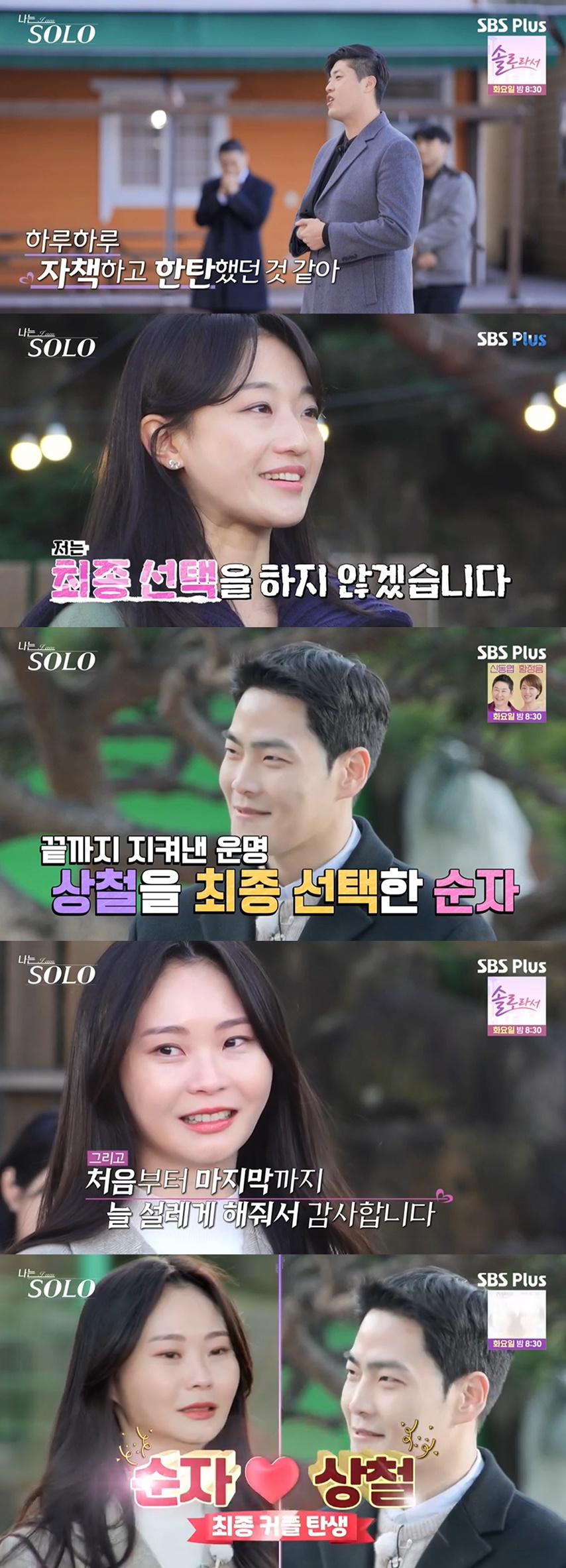 영철은 최종 선택을 하지 않았고, 현숙과 영숙 역시 포기했다. 연이어 최종 선택을 포기하는 가운데, 상철은 일편단심으로 순자를 선택했다. 순자는 "처음부터 마지막까지 늘 설레게 해줘서 감사하다"며 울컥하는 모습을 보이더니 상철을 선택함으로써 최종 커플로 매듭지었다.