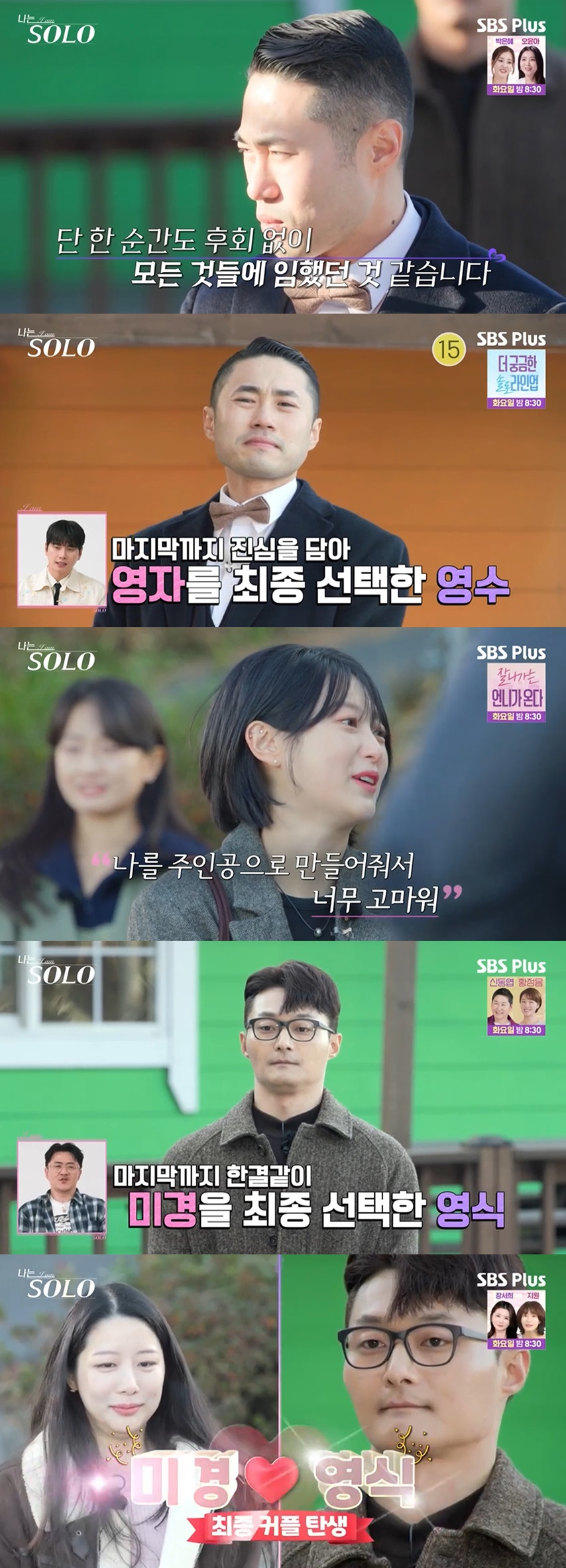 그러면서 "저 영수답게 끝까지 후회 없이 최종 선택을 하겠다"고 마지막까지 진심을 담아 영자를 최종 선택했다. 반면, 영자는 영수에게 "나를 주인공을 만들어줘서 너무 고맙다"는 감사 인사를 끝으로 최종 선택을 포기했다.