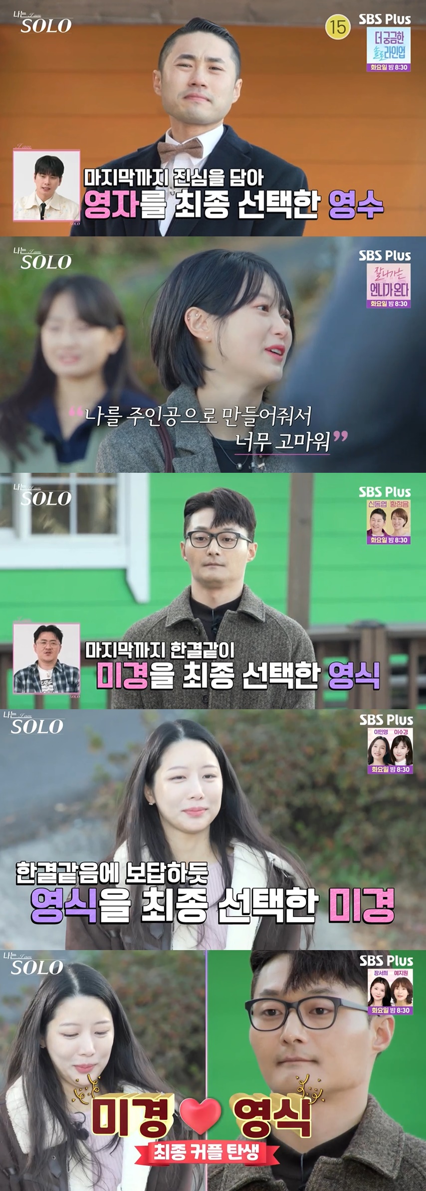 그러면서 "저 영수답게 끝까지 후회 없이 최종 선택을 하겠다"고 마지막까지 진심을 담아 영자를 최종 선택했다. 반면, 영자는 영수에게 "나를 주인공을 만들어줘서 너무 고맙다"는 감사 인사를 끝으로 최종 선택을 포기했다.