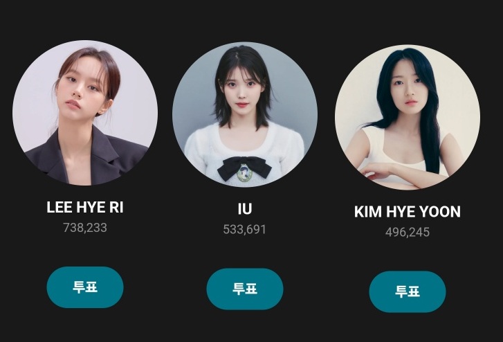 예상대로 73만 표를 얻은 혜리에 맞서 2위 아이유(53만3천 표), 3위 김혜윤(49만6천 표)이 뒤따르고 있다.
