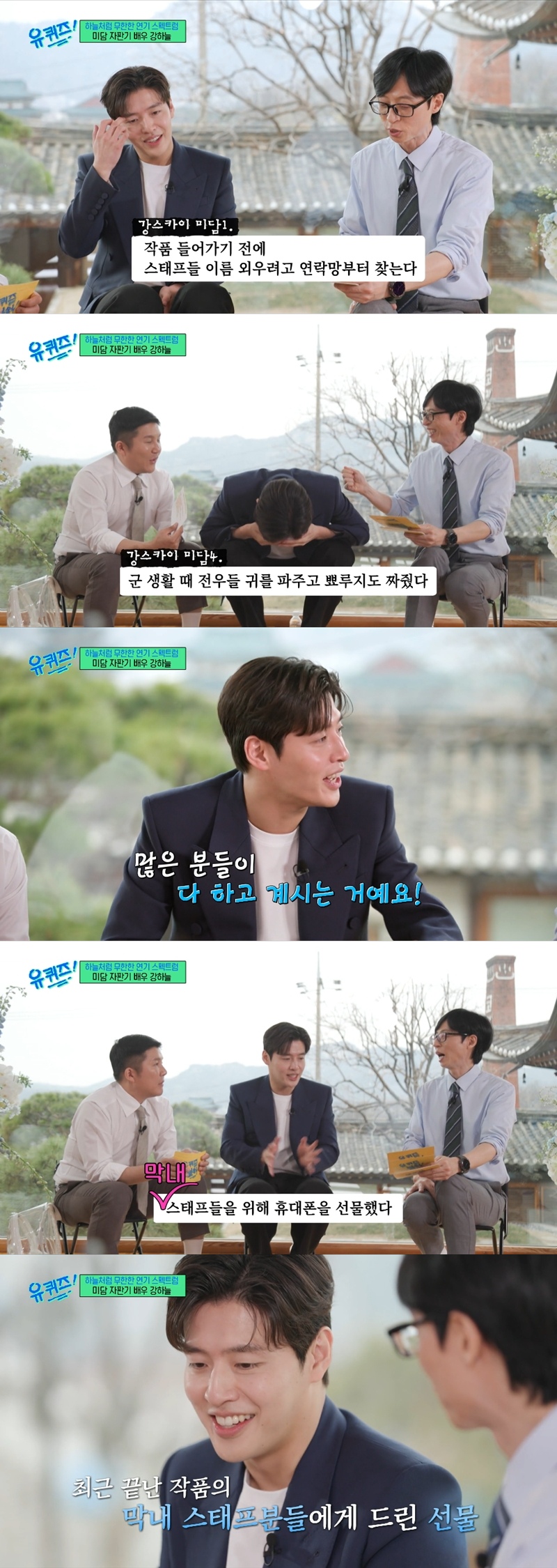유재석이 스태프들 이름 암기를 위한 연락망 미담의 사실 여부를 묻자 강하늘은 "어릴 때 '무한도전' 보고 그럴 때부터 재석 선배님이 스태프분들을 이름으로 이야기하는 걸 보고 현장 분위기가 그려지더라. '저기'라고 부르기엔 같은 작품 하는 식구인데 정 없지 않냐"며 유재석의 영향으로 시작하게 되었음을 전했다.