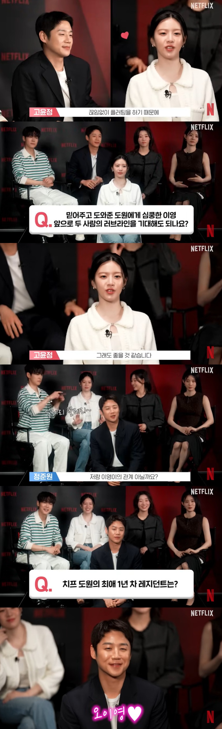 이후 정준원의 고윤정 언급은 계속됐다. 구도원의 최애 1년 차 레지던트에는 망설임 없이 "오이영"이라고 답했고, 강유석이 "저는요"라고 서운함을 내비치자 고윤정은 "이건 인정해 달라"며 흐뭇한 모습을 보였다.