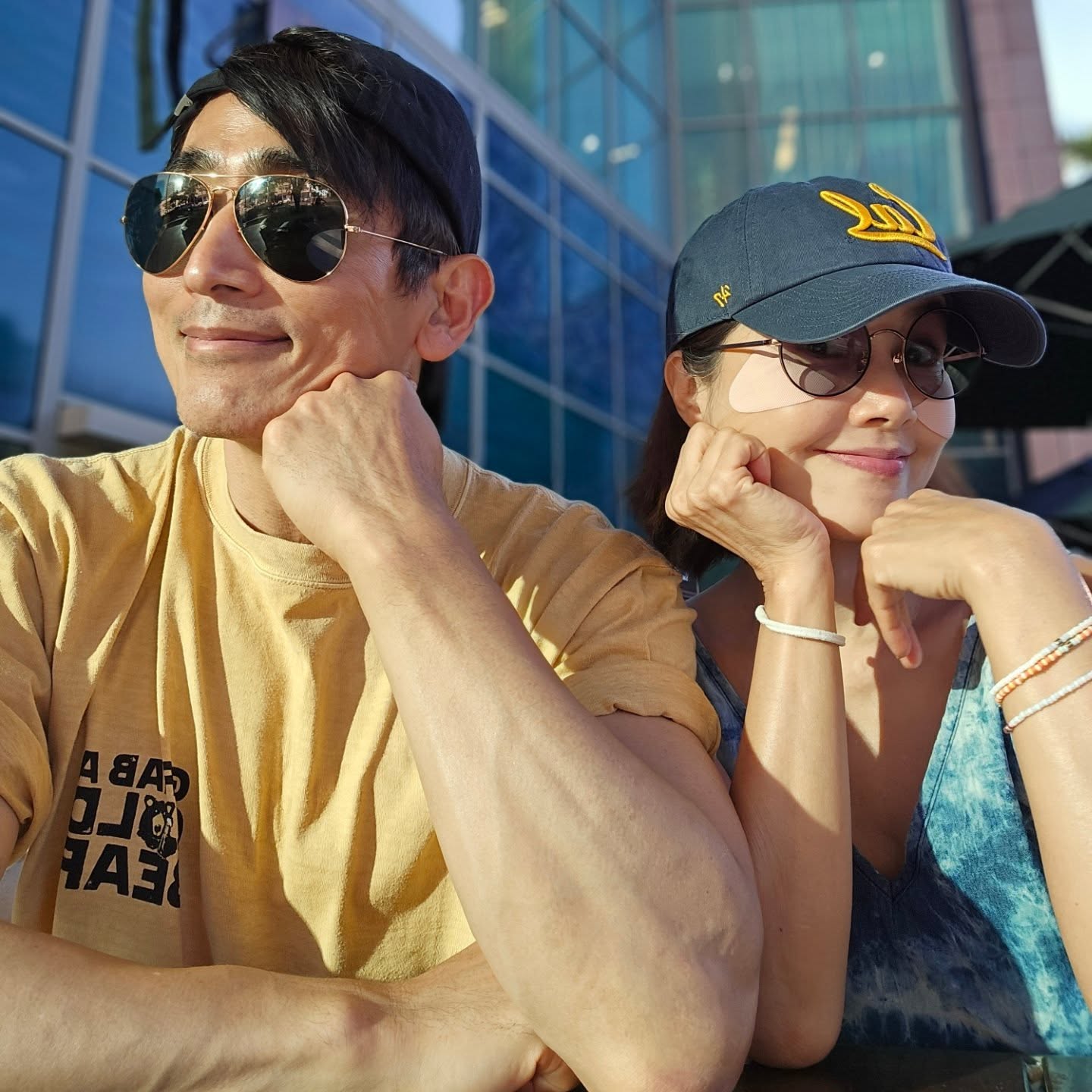 사진 속에는 모자와 선글라스를 착용하고 같은 포즈로 카메라를 응시하는 차인표 신애라의 모습이 담겨 있다. 두 사람의 장난 가득한 표정이 인상적이다.