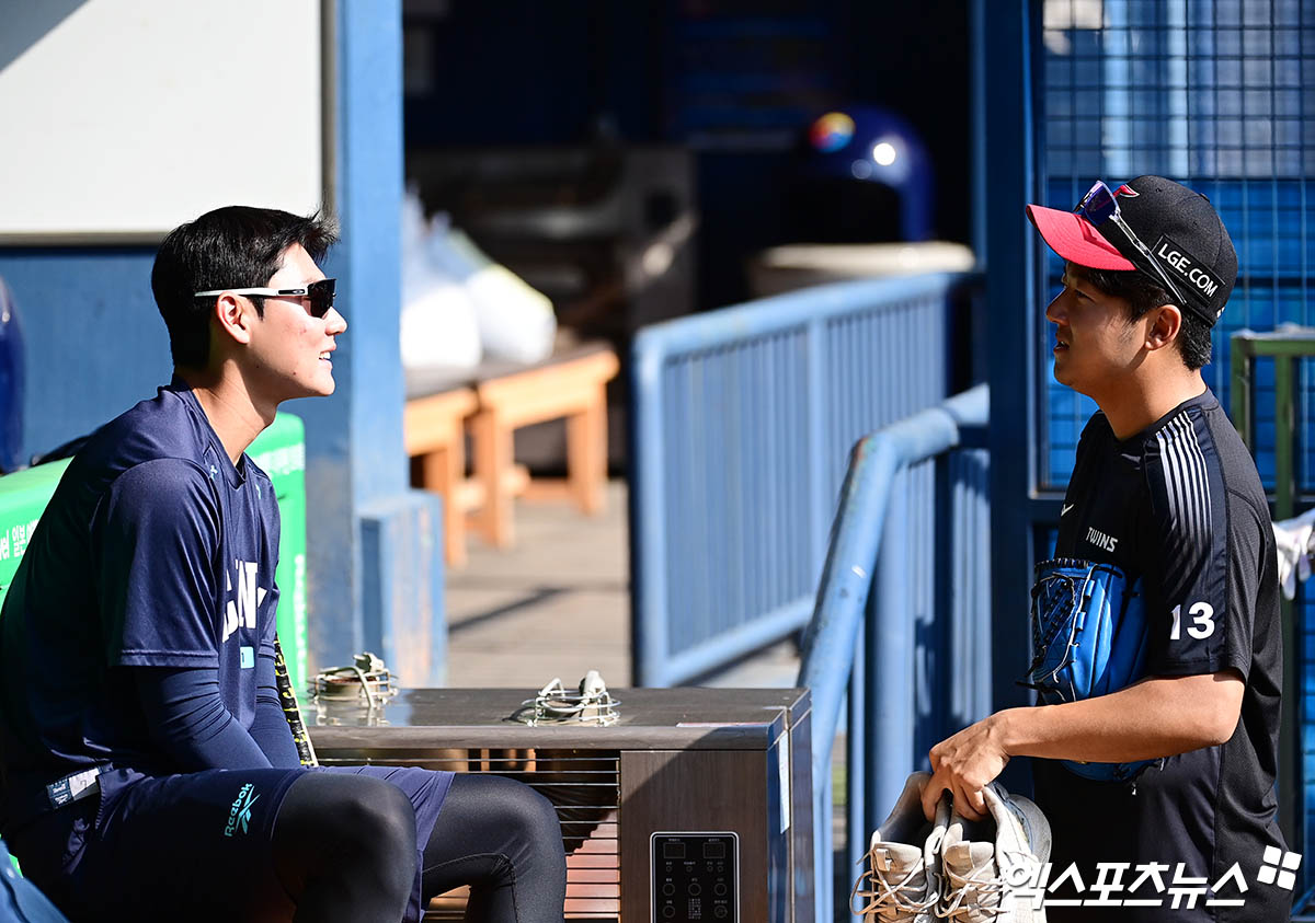 (엑스포츠뉴스 잠실, 박지영 기자) 24일 오후 서울 송파구 잠실야구장에서 열리는 '2025 신한 SOL Bank KBO리그' NC 다이노스와 LG 트윈스의 경기에 앞서 NC 김주원과 LG 송승기가 이야기를 나누고 있다.