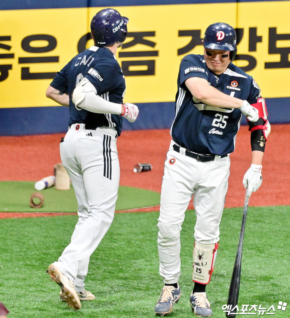 (엑스포츠뉴스 고척, 김한준 기자) 24일 오후 서울 구로구 고척스카이돔에서 열린 '2025 신한 SOL Bank KBO리그' 두산 베어스와 키움 히어로즈의 경기, 3회초 무사 1루 두산 케이브가 투런 홈런을 날린 후 양의지와 함께 기뻐하고 있다.