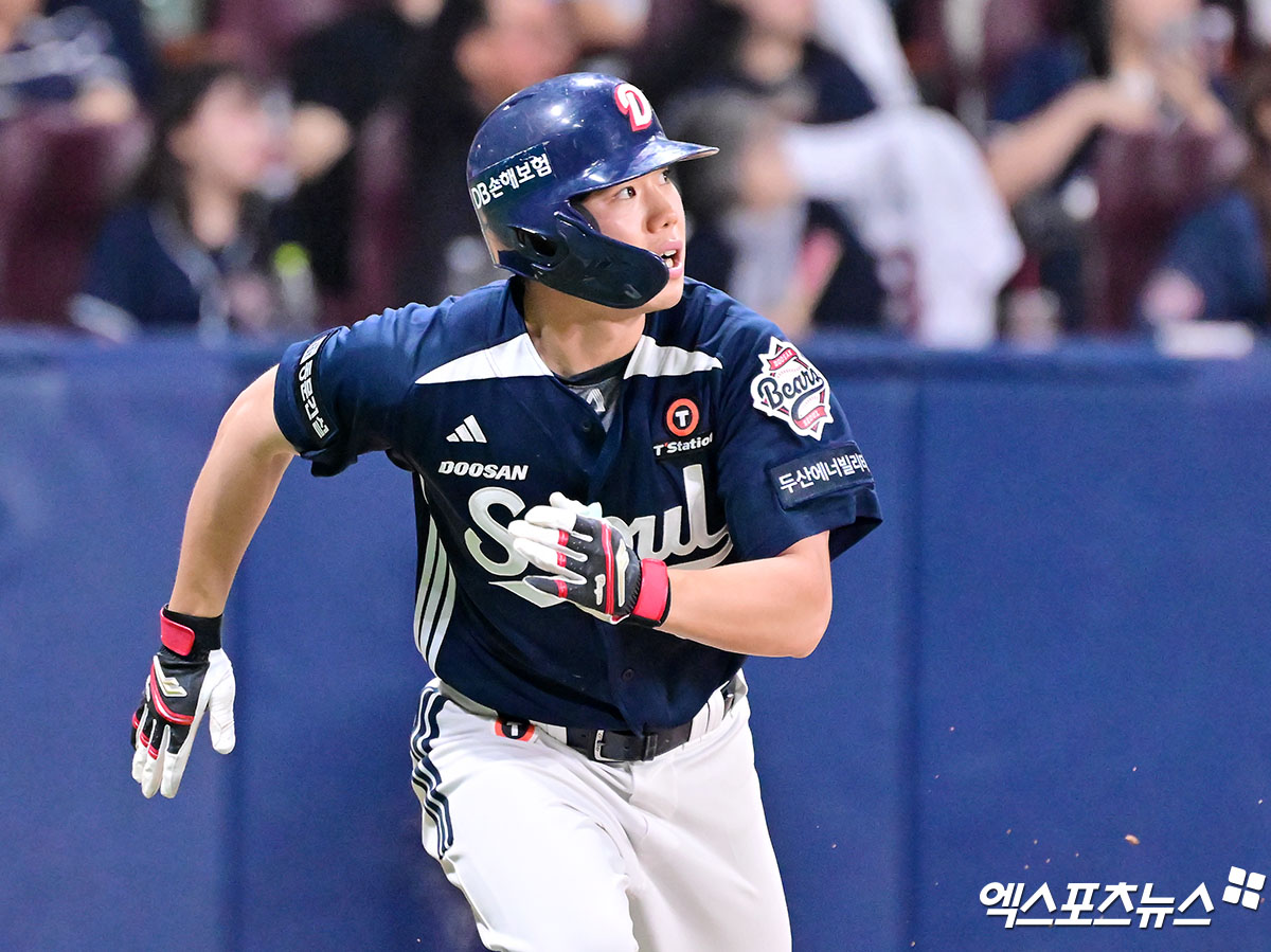 (엑스포츠뉴스 고척, 김한준 기자) 24일 오후 서울 구로구 고척스카이돔에서 열린 '2025 신한 SOL Bank KBO리그' 두산 베어스와 키움 히어로즈의 경기, 4회초 1사 3루 두산 오명진이 1타점 2루타를 날리고 있다.