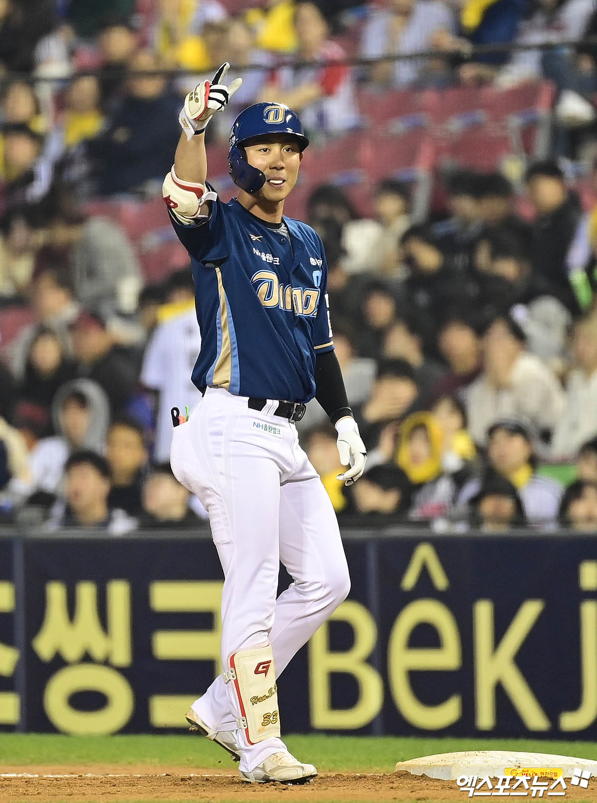 (엑스포츠뉴스 잠실, 박지영 기자) 24일 오후 서울 송파구 잠실야구장에서 열린 '2025 신한 SOL Bank KBO리그' NC 다이노스와 LG 트윈스의 경기, 7회초 1사 1,2루 NC 한석현이 안타를 때려낸 뒤 세리머니를 하고 있다.
