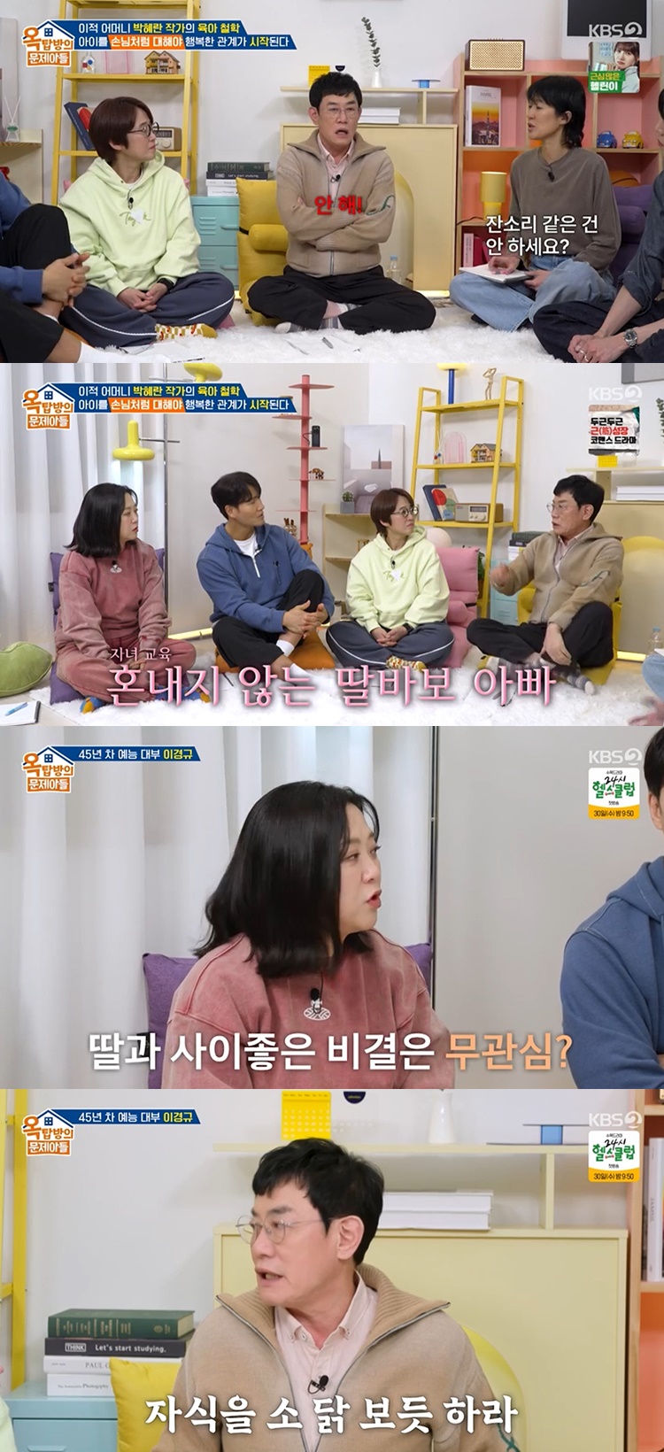 이경규는 딸 이예림과 얽힌 에피소드를 공개하기도 했다. 그는 딸에게 잔소리를 하지 않으며 딸을 혼낸 적도 없다고 밝혔다. 딸과 사이 좋은 비결에 대해 이경규는 "무관심"이라며 "자식을 소 닭 쳐다보듯 해라. 나랑 예림이는 객체고 다른 존재다"라며 자신만의 교육관을 전했다.