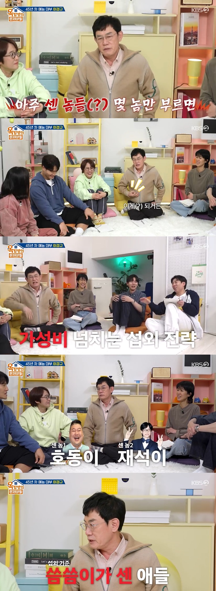 24일 방송된 KBS2 ‘옥탑방의 문제아들’에서는 베스트셀러 작가로 돌아온 이경규가 출격, 예능계에서 활약 중인 ‘옥문아’ 6MC를 향해 뼈있는 독설을 날리며 예능 대부다운 독보적인 존재감을 뽐냈다.
