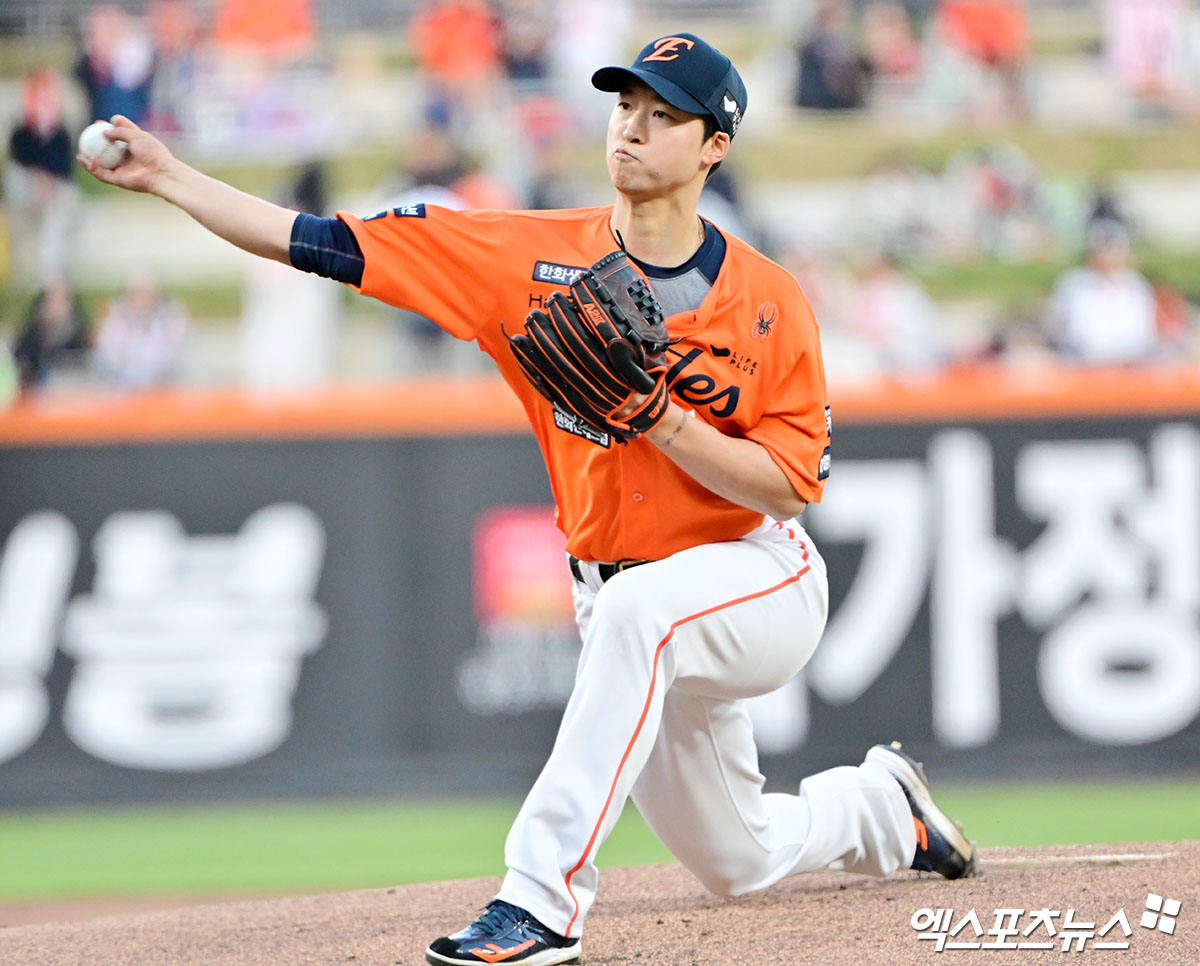 ​​​​​​​(엑스포츠뉴스 대전, 김한준 기자) 25일 오후 대전 한화생명 볼파크에서 열린 '2025 신한 SOL Bank KBO리그' KT 위즈와 한화 이글스의 경기, 1회초 한화 선발투수 엄상백이 공을 힘차게 던지고 있다.