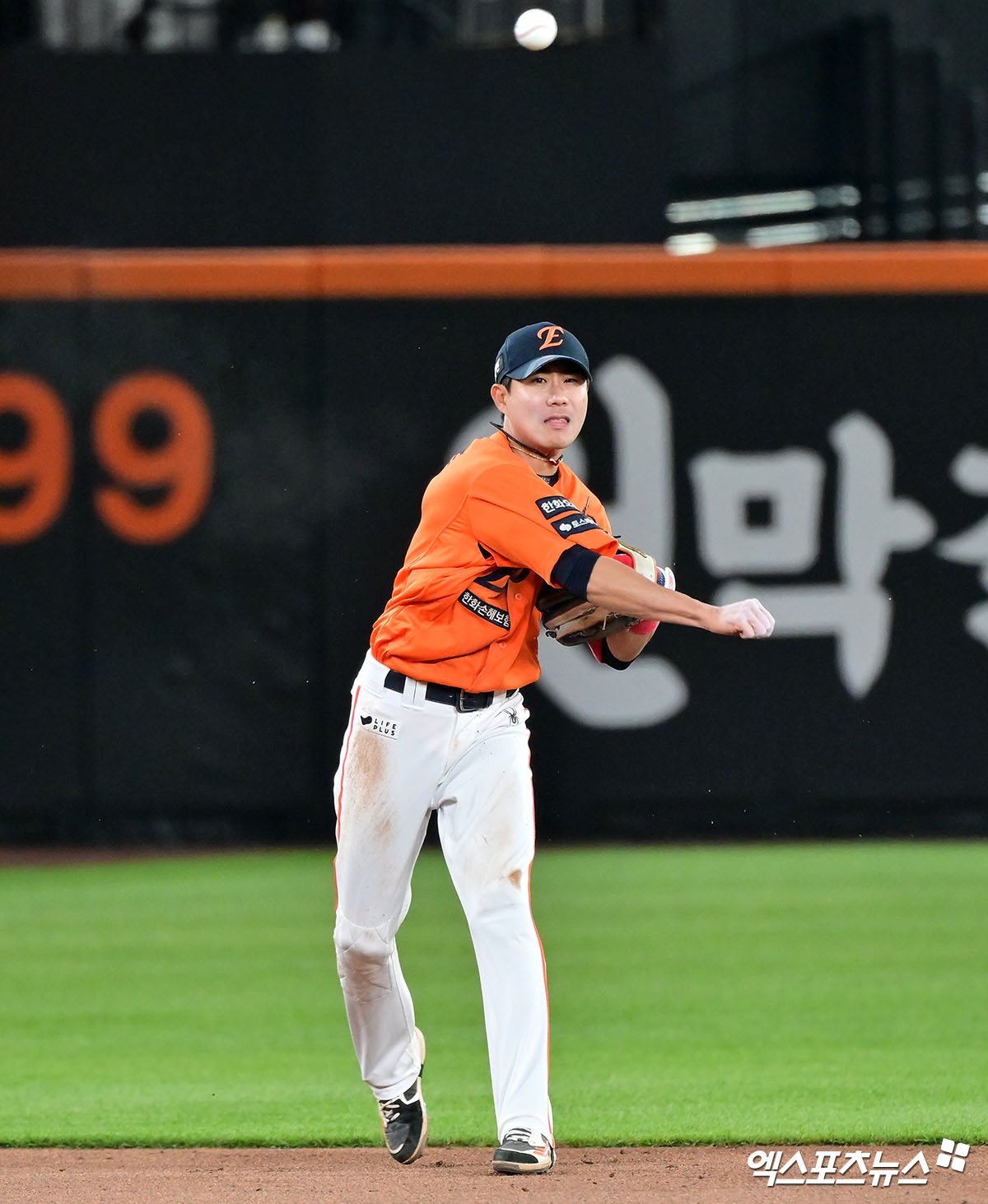 (엑스포츠뉴스 대전, 김한준 기자) 25일 오후 대전 한화생명 볼파크에서 열린 '2025 신한 SOL Bank KBO리그' KT 위즈와 한화 이글스의 경기, 5회초 1사 한화 심우준이 KT 허경민의 타구를 처리하고 있다.