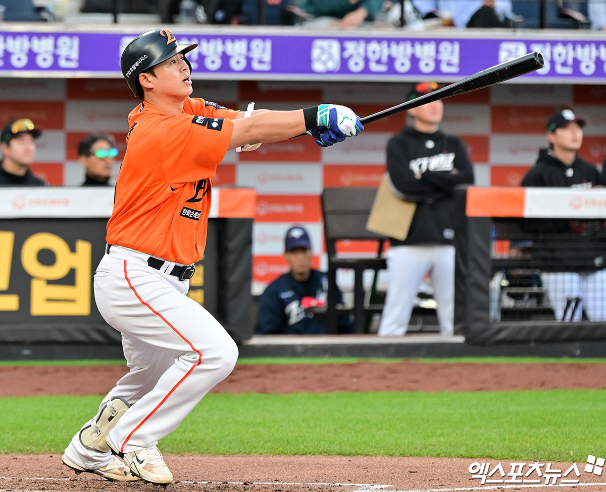 (엑스포츠뉴스 대전, 김한준 기자) 26일 오후 대전 한화생명 볼파크에서 열린 '2025 신한 SOL Bank KBO리그' KT 위즈와 한화 이글스의 경기, 5회말 2사 한화 노시환이 타격을 하고 있다. 결과는 우익수 플라이 아웃.