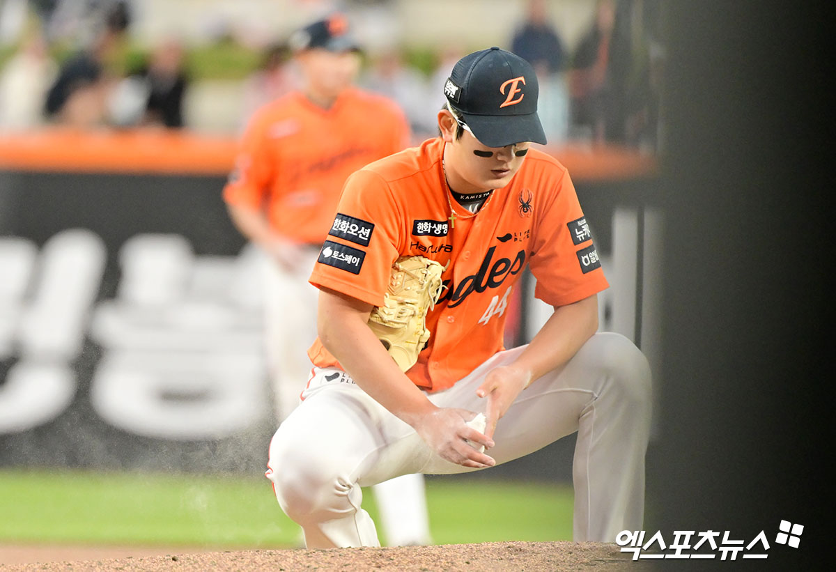 (엑스포츠뉴스 대전, 김한준 기자) 26일 오후 대전 한화생명 볼파크에서 열린 '2025 신한 SOL Bank KBO리그' KT 위즈와 한화 이글스의 경기, 9회초 한화 김서현이 투구 준비를 하고 있다.