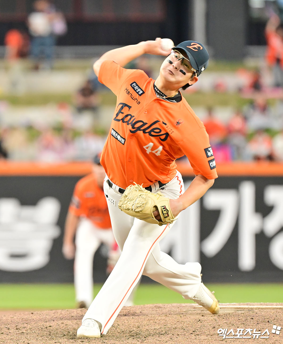 (엑스포츠뉴스 대전, 김한준 기자) 26일 오후 대전 한화생명 볼파크에서 열린 '2025 신한 SOL Bank KBO리그' KT 위즈와 한화 이글스의 경기, 9회초 한화 김서현이 공을 힘차게 던지고 있다.