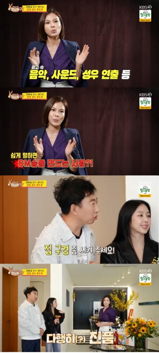 27일 방송된 KBS 2TV '사장님 귀는 당나귀 귀'에서는 음악감독 전수경이 박명수가 기획한 '걸어서 보스 집으로'의 첫 보스로 등장해 눈길을 끌었다.