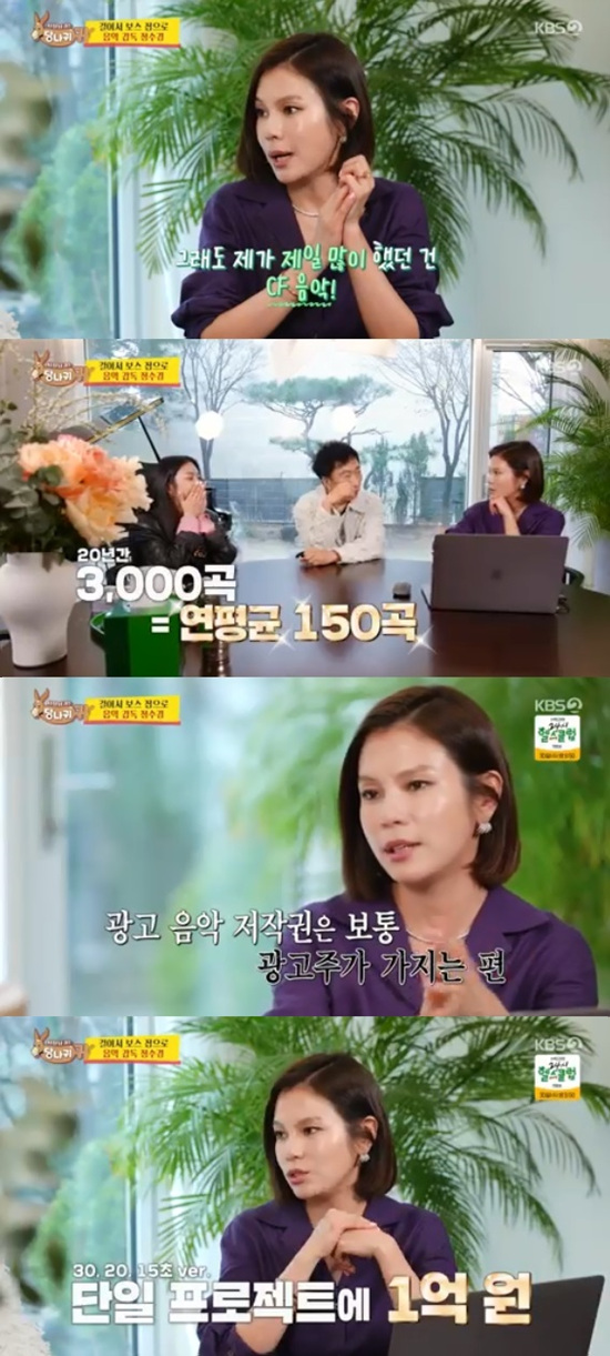 전수경은 지금껏 작업한 광고 음악이 3000곡에 달한다고 알려주며 다니엘 헤니가 출연한 증권사 광고 음악을 비롯해 대표작들을 들려줬다.