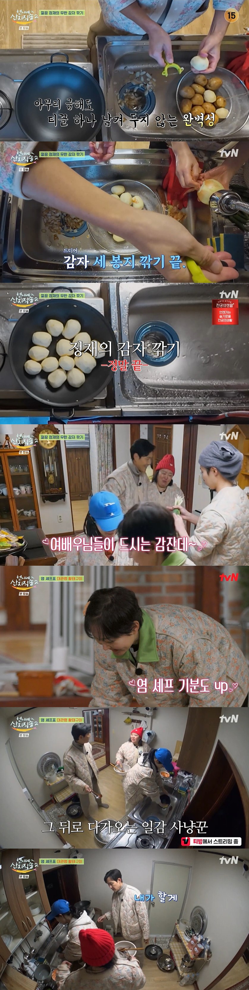 이에 임지연은 "앉아 있을 생각은 하지도 마라"며 현실 조언을 건넸고, 이정재는 홀로 주방으로 이동해 본격적으로 감자 깎기에 나섰다.