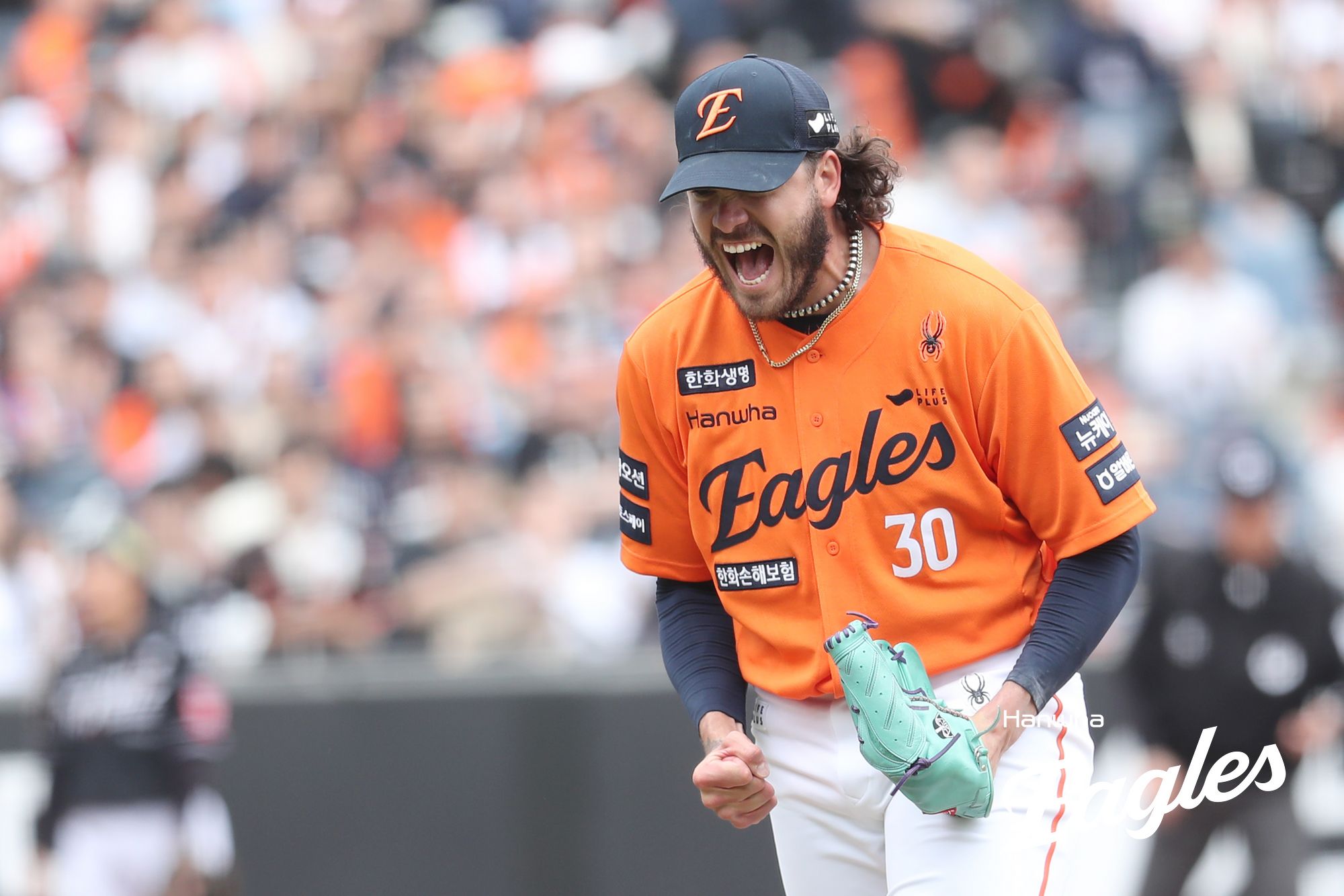 폰세와 오원석이 모두 6이닝을 소화한 후에도 여전히 점수는 2-0. 초반 승부가 길어지며 6회까지 이미 93개의 공을 던졌던 폰세는 7회초에도 마운드에 올랐다. 그리고 유격수 심우준의 호수비 도움을 받아 황재균을 직선타 처리, 윤준혁을 유격수 땅볼로 돌려세운 뒤 배정대에게 3구삼진을 솎아냈다. 배정대에게 던진 3구 직구에 방망이가 헛돌자 폰세는 크게 포효하며 이날 자신의 투구를 마무리했다.