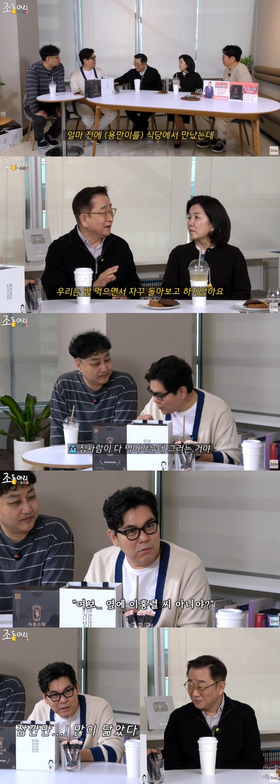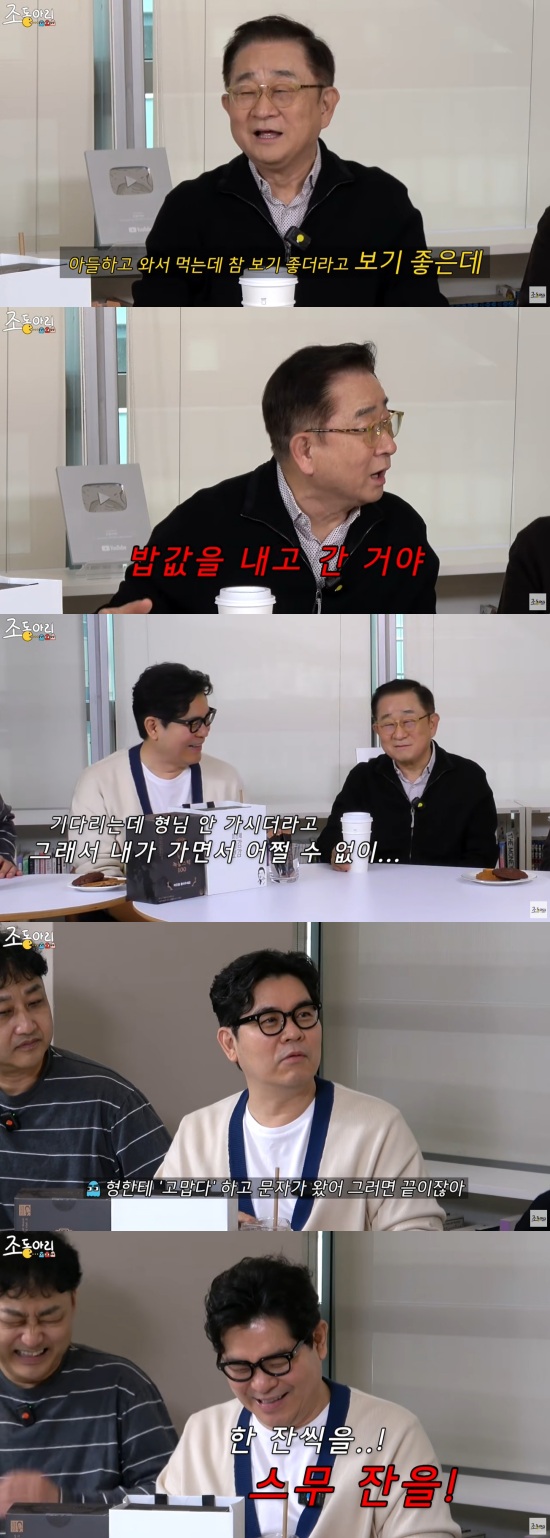 이홍렬은 "아들하고 와서 먹는데 참 보기 좋더라. 그런데 중요한 건 (용만이네가) 먼저 갔다. 먼저 가면서 밥값을 내고 간 것"이라고 비하인드를 전했다. 이를 들은 김용만은 "기다리는데 형님 안 가시더라. 그래서 내가 가면서 어쩔 수 없이"라고 너스레를 떨었다.