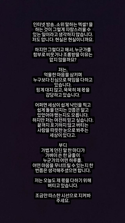 부디 가볍게 던진 말 한마디가 가벼이 쓴 한 글줄이 누군가의 어떤 하루를 어떤 마음을 무너뜨릴 수 있는지 한번쯤은 생각해주셨으면 합니다.