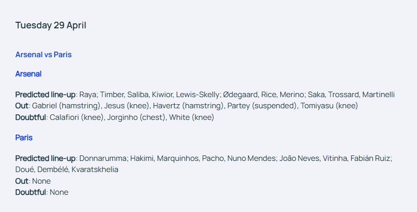 다만 UEFA는 공식 홈페이지를 통해 챔피언스리그 준결승 1차전 예상 라인업을 공개했다. 이때 이강인이 아스널과의 첫 번째 대결에서 선발로 나서지 못할 것으로 내다봤다.