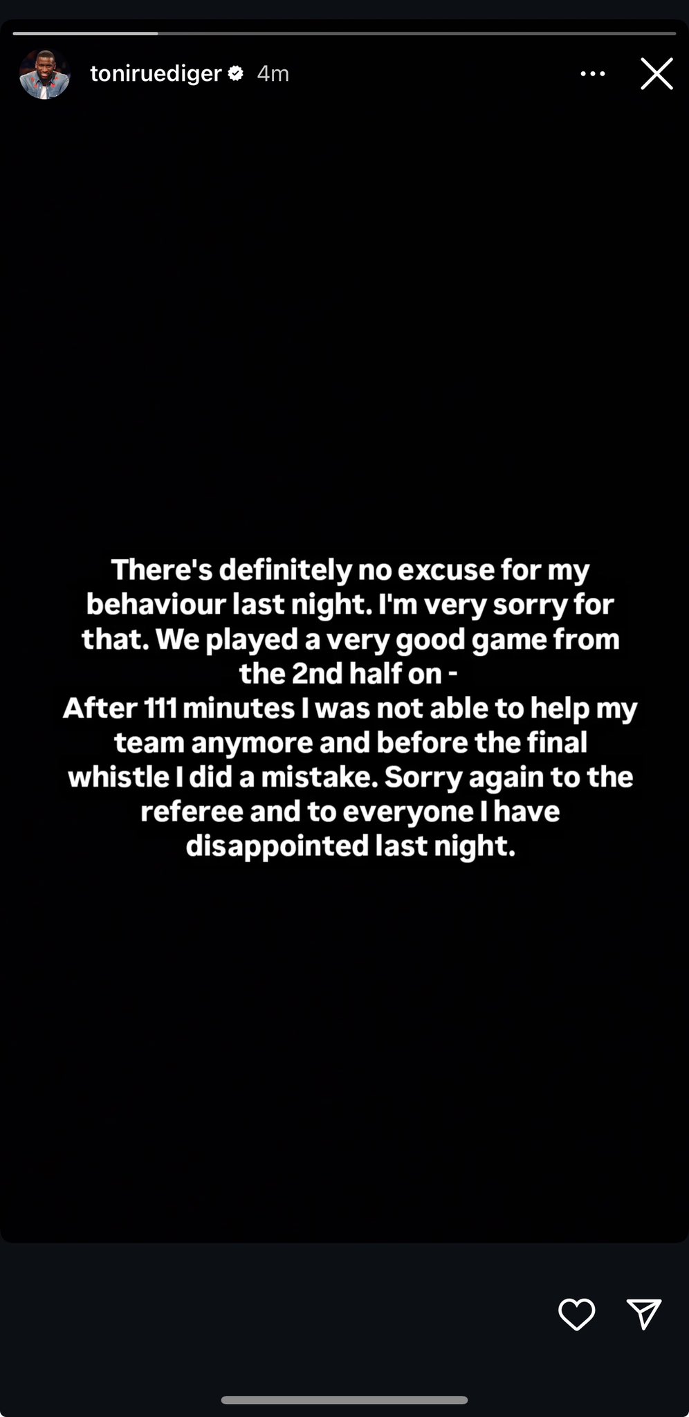 결국 뤼디거는 자신의 행동에 대해 사과했다.