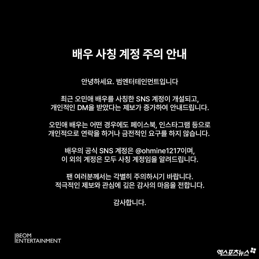 소속사는 "최근 오민애 배우를 사칭한 SNS 계정이 개설되고, 개인적인 DM을 받았다는 제보가 증가하여 안내드립니다"라며 "오민애 배우는 어떤 경우에도 페이스북, 인스타그램 등으로 개인적으로 연락을 하거나 금전적인 요구를 하지 않습니다"라고 전했다.