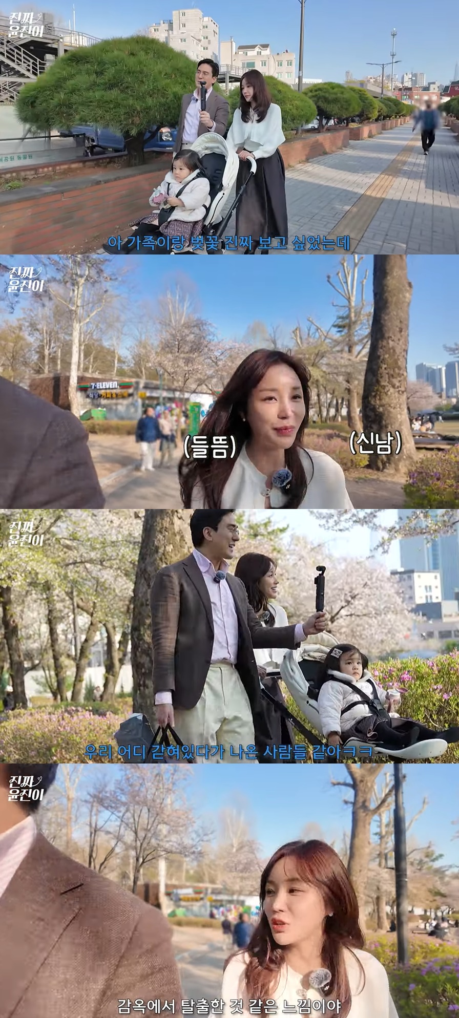 남편이 "우리 어디 갇혀있다가 나온 사람들 같다"고 웃자 윤진이는 "그니까. 감옥에서 탈출한 것 같은 느낌"이라고 공감했다.
