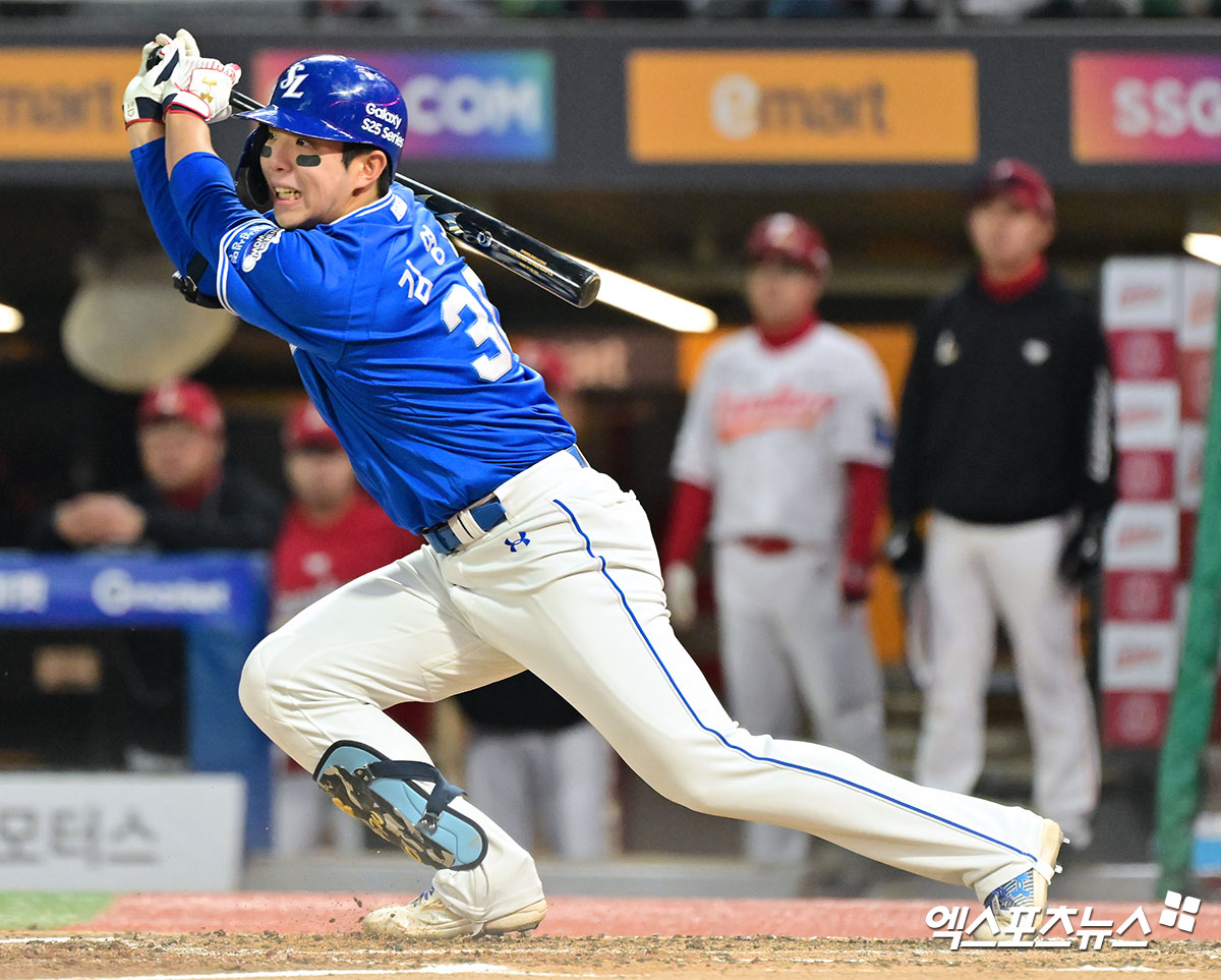 (엑스포츠뉴스 인천, 김한준 기자) 29일 오후 인천SSG랜더스필드에서 열린 '2025 신한 SOL Bank KBO리그' 삼성 라이온즈와 SSG 랜더스의 경기, 4회초 1사 삼성 김영웅이 타격을 하고 있다. 결과는 유격수 앞 내야안타 출루.