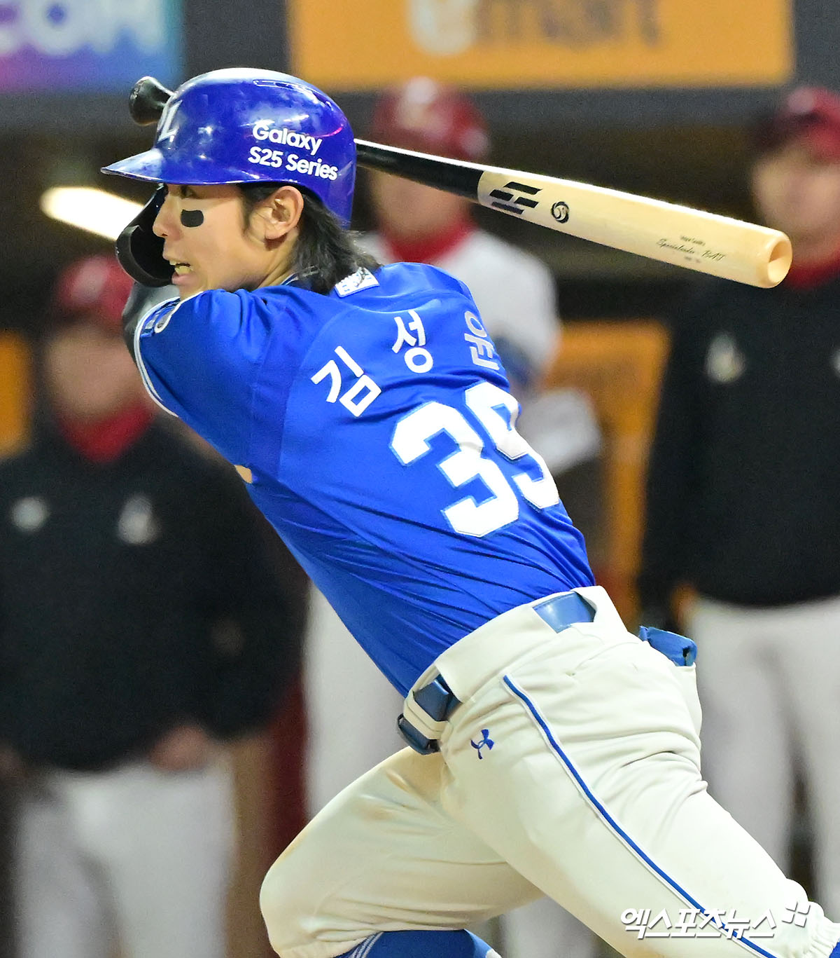 (엑스포츠뉴스 인천, 김한준 기자) 29일 오후 인천SSG랜더스필드에서 열린 '2025 신한 SOL Bank KBO리그' 삼성 라이온즈와 SSG 랜더스의 경기, 9회초 2사 3루 삼성 김성윤이 1타점 적시타를 날리고 있다.