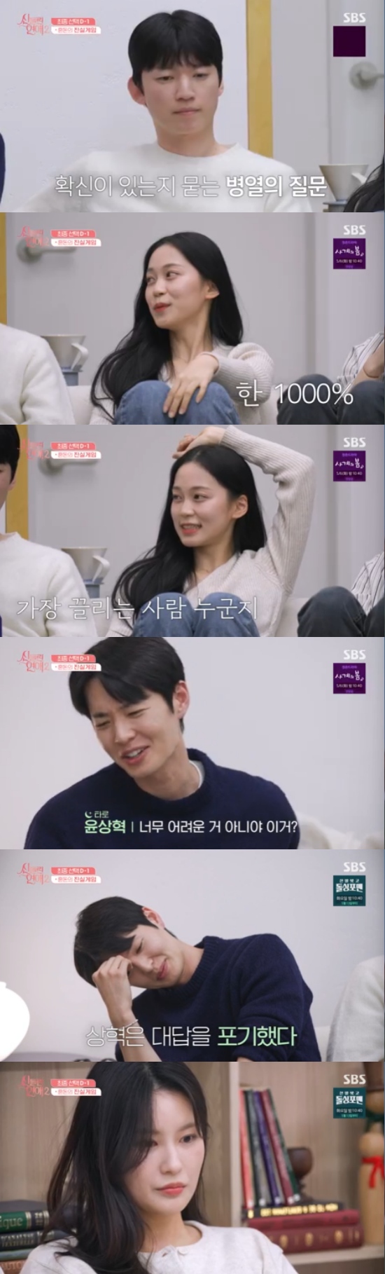 이어 하병열은 자신의 호감 상대인 채유경에게 "마음이 좀 잡히는지 궁금하다"면서 상대에 대한 확신이 있는지 물었고, 채유경은 "1000%"라고 확신에 찬 대답을 했다.