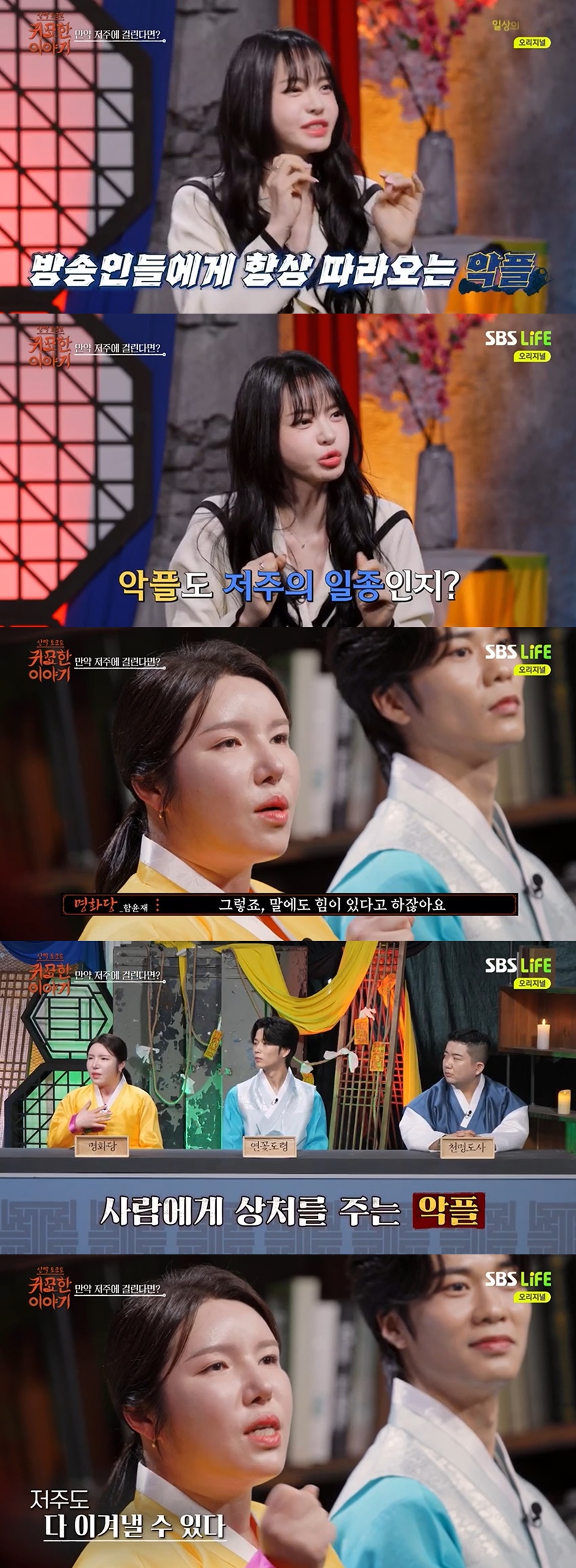 서유리는 "사실 방송을 하는 사람들은 악플이 달린다. '죽어라!' 이런 것도 저주의 일종이냐"고 물었고, 무속인 함윤재는 "맞다. 말에도 힘이 있다고 하듯이 악플에 상처를 많이 받는다. 마음의 중심을 잃지 않고 잘 잡는다면 저주와 비방도 이겨낼 수 있다"고 답했다.